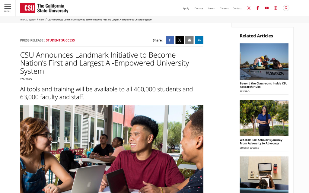 昨天,看到了2月4日,美国加州州立大学系统 (CSU)的新闻,该校为超过 46 万名学生和超过 6.3 万名教职员工提供ChatGPT Edu版本, 这是 ChatGPT 专为教育机构定制的版本。 这是全球范围内单个组织或公司对 ChatGPT 的最大规模应用。