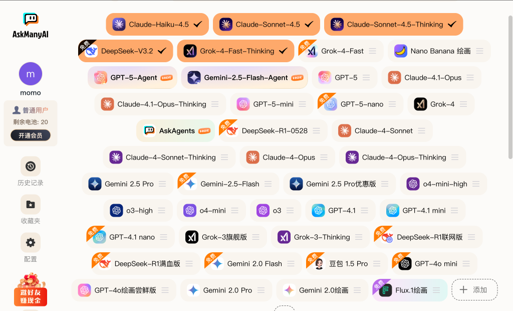 AskManyAI 提供了免费试用的机会,很多热门模型都可以免费体验。
