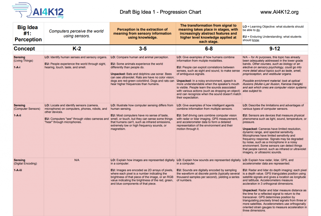 除了清晰的内容框架,AI4K12的教学指南还为从幼儿园到高中12年级的每个阶段都设定了具体的学习目标,推荐了实验、手工模拟、设计开发和案例分析等多种教学活动。