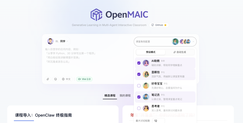 这个OpenMAIC是一个人工智能互动课堂平台,它能够将任何主题或文档转化为丰富的互动学习体验。