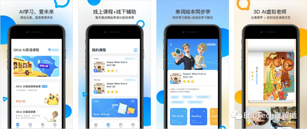 这四款AI授课产品分别是:aiKID在线英语课堂、叮咚课堂、葡萄英语、以及GKid英语。