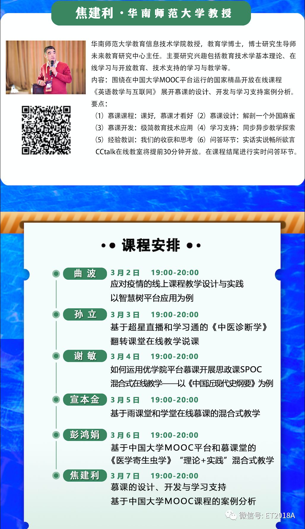 在今天晚上7⃣️点的题为《慕课的设计、开发与学习支持:基于中国大学MOOC课程的案例分析》的讲座中,焦建利围绕将他和他的团队在过去十年的全球追踪和研究实践,尤其是结合在中国大学MOOC平台的《英语教学与互联网》 慕课,就慕课的课程设计、开发与学习支持进行案例分析。